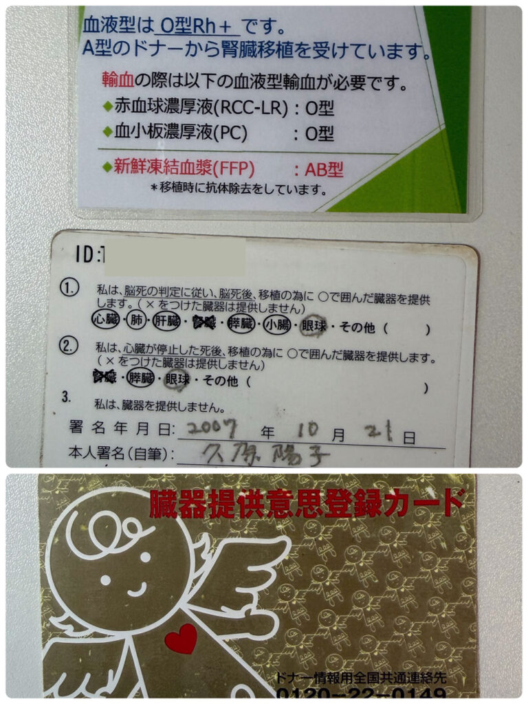 私の「臓器提供意思表示カード」と、輸血時の注意カード。